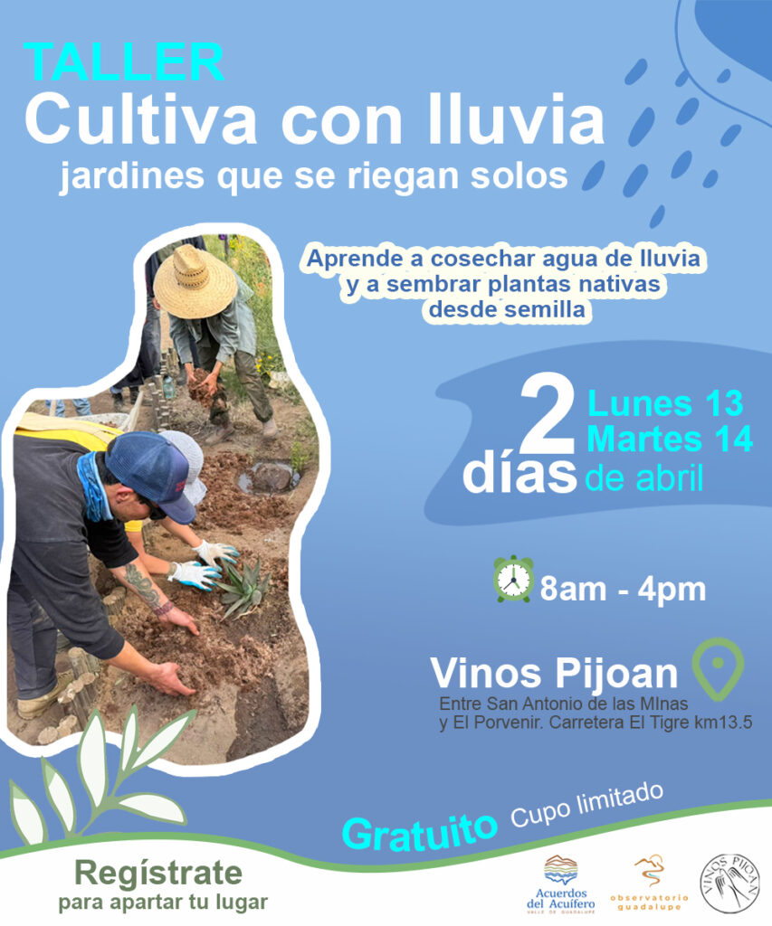 Impartido por Paula Pijoan, especialista en restauración y paisajismo con plantas nativas y Claire Acosta, certificada en Diseño de Captación de Agua de Lluvia por el Watershed management group.